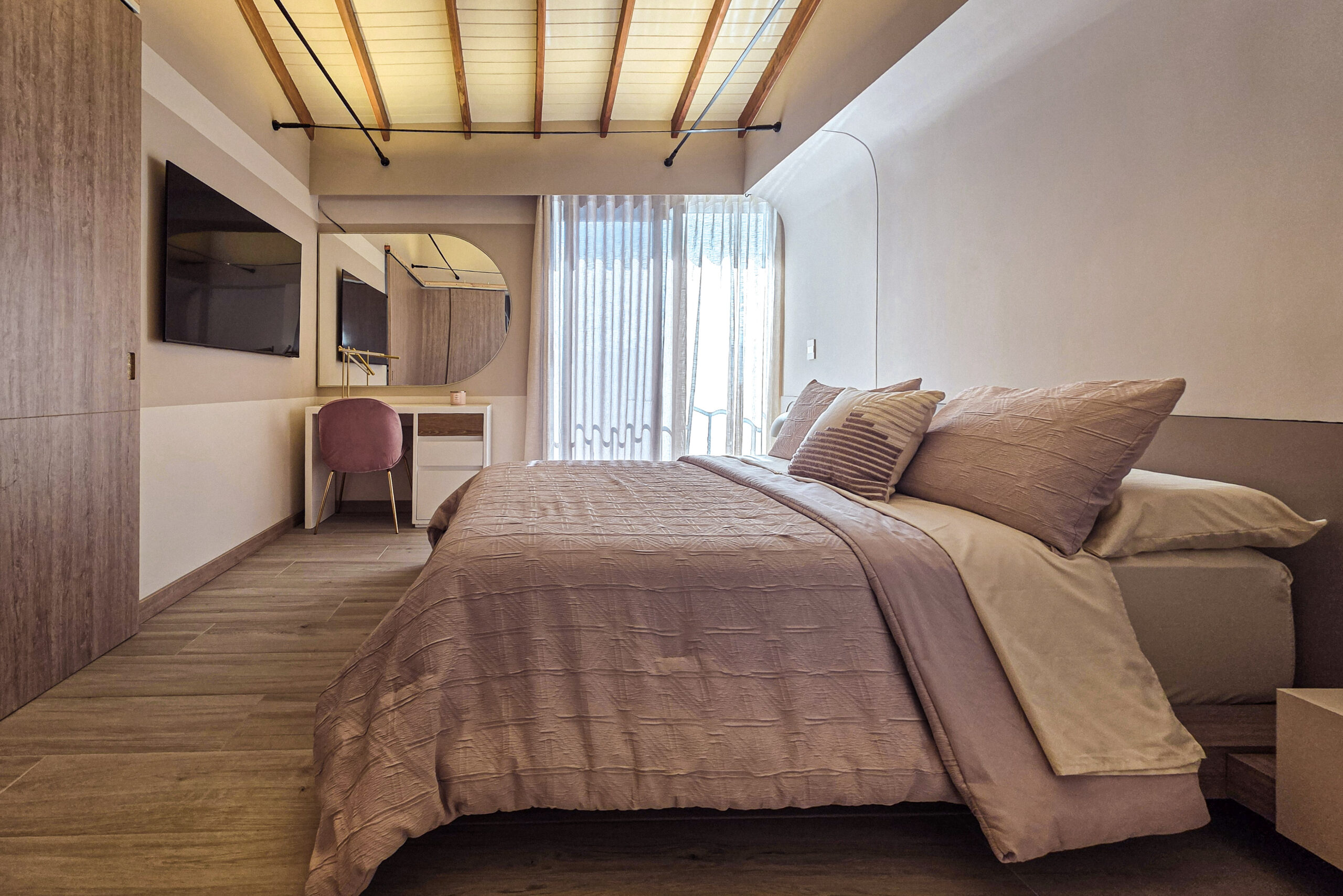 La escalera fue reconstruida para aportar fluidez y carácter, mientras que en el segundo piso se renovaron todas las habitaciones y baños, otorgándoles confort, modernidad y coherencia estética.